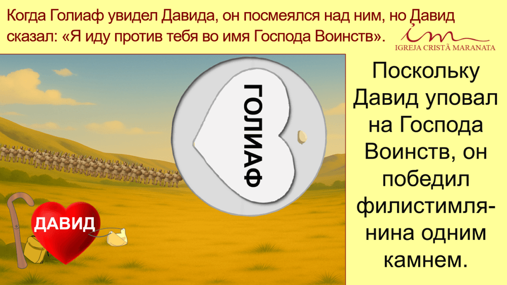 Сегодня у нас тоже есть великаны. Иногда великан — это страх, печаль или непослушание. И как нам победить этих великанов? С помощью духовного оружия, которое дал нам Бог (2 Коринфянам 10:4).